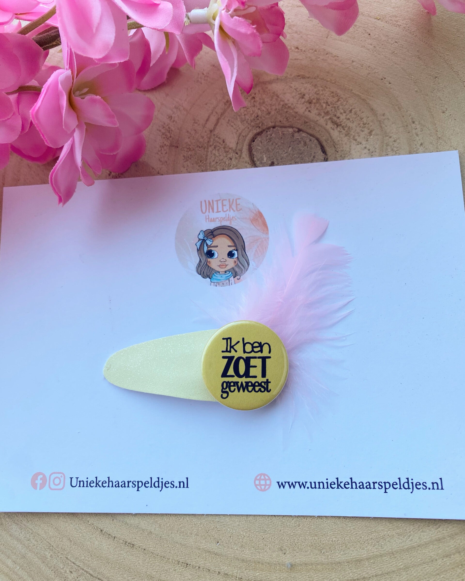 Pastel geel haarspeldje ik ben zoet geweest met veertje